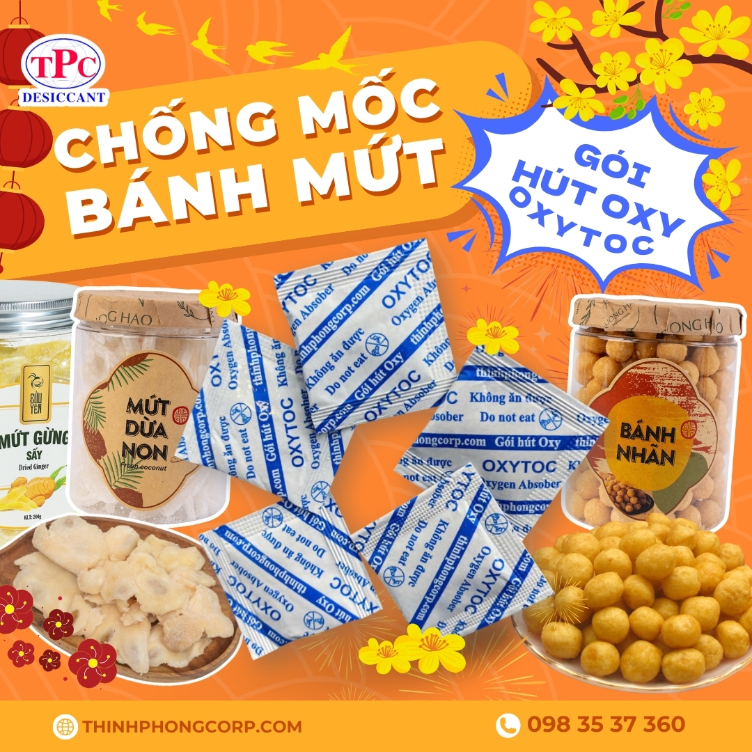 Oxytoc đặc biệt phù hợp với các dòng bánh mứt Tết như mứt dừa, mứt gừng, mứt me, kẹo lạc, bánh quy handmade… Những sản phẩm chứa đường và độ ẩm nhẹ vốn rất nhạy cảm với oxy.