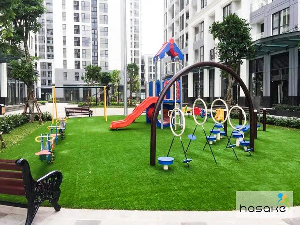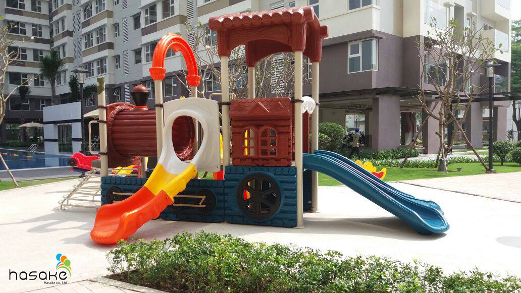 Hãy cùng Hasake điểm qua một số các thiết bị sân chơi trẻ em mà thường được các chủ đầu tư ưa thích lựa chọn. + Bộ cầu trượt liên hoàn luôn được ưu tiên là lựa chọn đầu tiên trong danh sách thiết bị sân chơi cần có. Với rất nhiều các thiết kế đa dạng và kích thước từ nhỏ đến lớn, có thể kết hợp nhiều trò chơi trên cùng 1 hệ thống liên hoàn, vừa rèn luyện tính tập thể và cũng nâng cao sức khỏe của trẻ khi vận động leo trèo. + Sàn cao su EPDM: sân chơi dành cho trẻ em thì luôn ưu tiên tính an toàn lên cao nhất. Bởi vậy việc một sân chơi cần được đặt trên bề mặt sàn cao su EPDM là một điều kiện gần như bắt buộc đối với mỗi bản thiết kế. Với khả năng thoát nước tốt không bị ảnh hưởng nhiều do thời tiết, dễ bảo trì, bảo dưỡng cũng như thay thế mới. +Xích đu: là một dạng vận động nhẹ nhàng, bên cạnh những thiết kế ghế ngồi thông thường thì ngày nay xích đu được các nhà sản xuất thiết bị sân chơi trẻ em sáng tạo ra nhiều loại an toàn hoặc mạo hiểm hơn với những cải tiến về ghế ngồi dành cho người chơi. +Bập bênh, thú nhún: Tuy chỉ chiếm một phần nhỏ diện tích sân chơi nhưng những đồ chơi này là bắt buộc phải có ở mỗi khu sân chơi vì phù hợp với tất cả mọi lứa tuổi cũng như rất an toàn và bền bỉ theo thời gian.