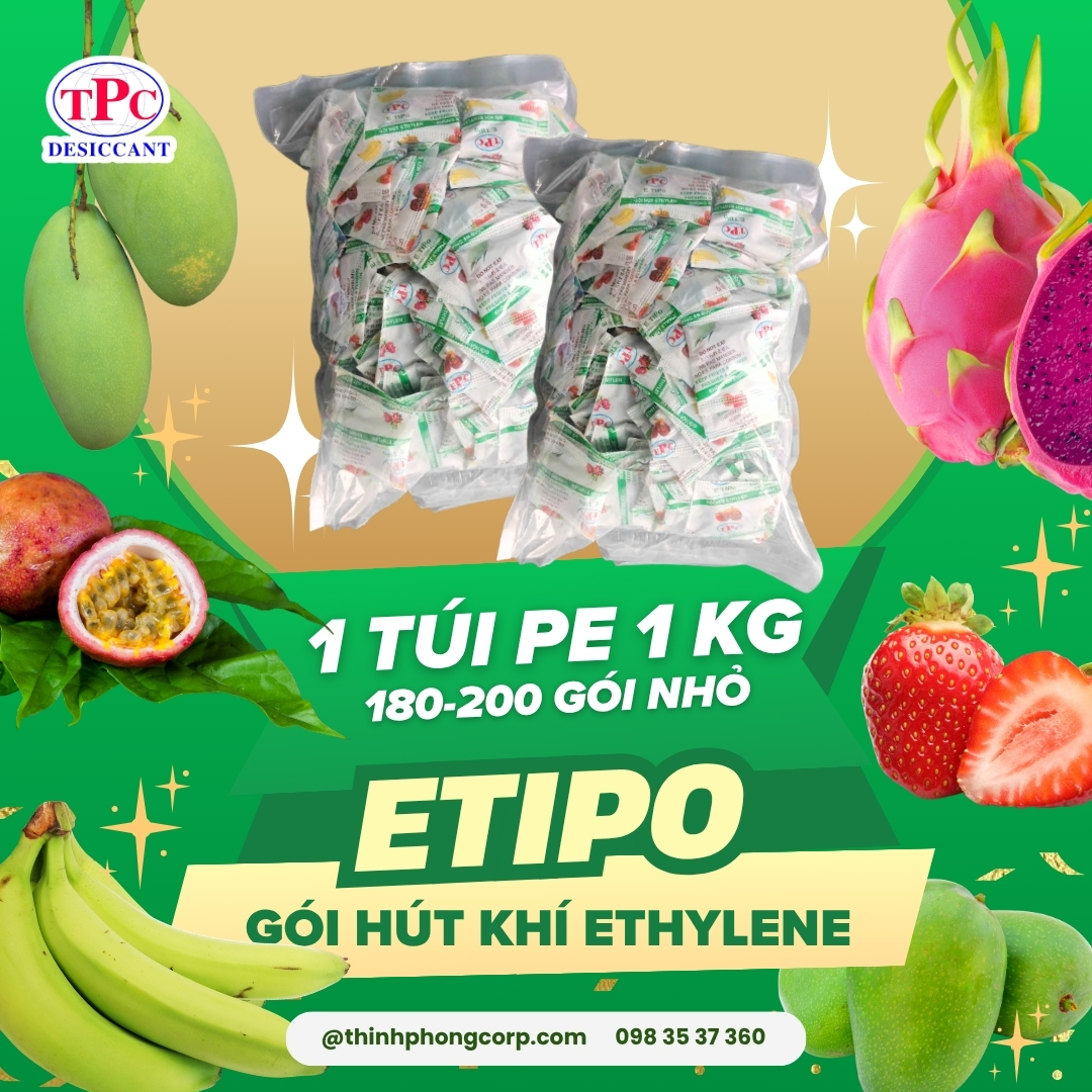 Gói hút Ethylene của chúng tôi chứa các hạt khoáng hoạt tính (thường là thuốc tím $KMnO_4$) giúp hấp thụ và oxy hóa khí Ethylene ngay khi chúng vừa thoát ra.