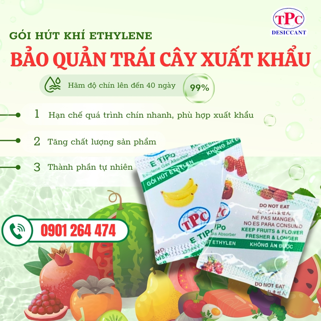 Giải pháp hiệu quả hiện nay là sử dụng gói hút ethylene trong quá trình đóng gói và vận chuyển. Gói hút có chức năng hấp thụ khí ethylene phát sinh, từ đó kiểm soát tốc độ chín của trái cây.