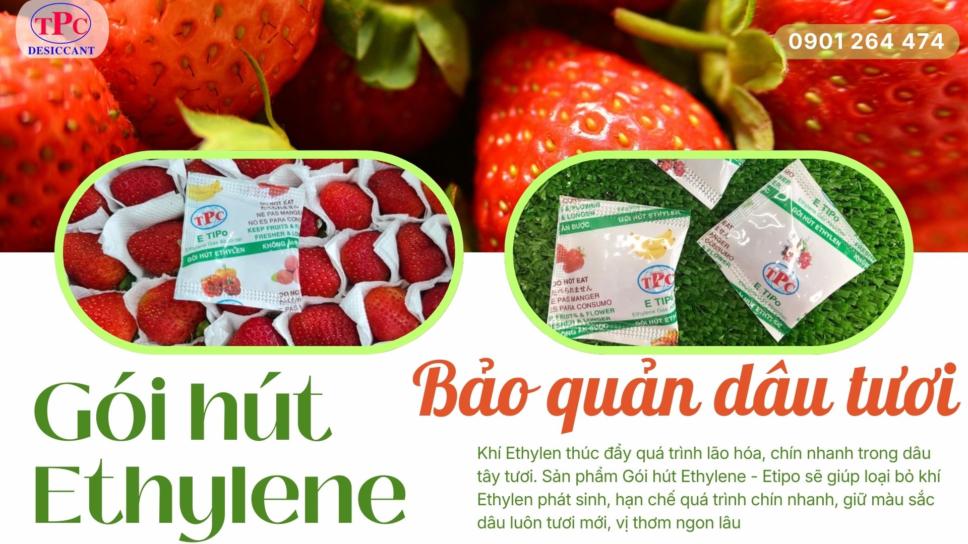Gói hút khí ethylen hoạt động bằng cách hấp thụ và phân hủy khí phát sinh trong quá trình hô hấp của trái. Khi nồng độ ethylen được giảm xuống, tốc độ chín của dâu chậm lại, giúp trái giữ độ cứng, màu đỏ tươi và hạn chế hư hỏng.