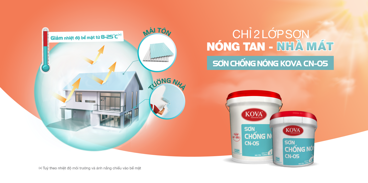 Nơi bán Sơn chống nóng đa năng KOVA CN-05 cho tường, mái tôn chính hãng giá rẻ chiết khấu cao tại TPHCM Liên hệ 0917041838 Ms Hồng Châu – Phòng tư vấn và bán hàng CN-05: là loại sơn hệ nước một thành phần, được chế tạo màng có khả năng chịu khí hậu nóng bức, liên kết với phụ gia phản quang có cấu trúc tinh thể hình là xếp lớp, có khoảng trống bên trong, ngăn cản truyền nhiệt và phản xạ ánh sáng, tạo thành thể đồng nhất bám chặt lên bề mặt mái tôn, tường ngăn, ngăn cản tia nắng mặt trời. CN-05: chống nóng theo quy luật phản xạ ánh sáng và cách nhiệt đồng thời làm giảm nhiệt độ bề mặt vật liệu, làm tăng chênh lệch nhiệt độ bên ngoài mái tôn, tường ngăn cách không gian bên trong và bên ngoài. Nhiệt độ càng cao thì sự chênh lệch nhiệt độ bên ngoài và bên trong nhà càng lớn. Với thời tiết nóng, khi nhiệt độ mái tôn lên đến 600C, nếu dùng sơn chống nóng CN-05 thì nhiệt độ bề mặt mái tôn giảm xuống 12-200C, còn nhiệt độ mái tôn khoảng 30-430C thì sẽ giảm xuống từ 5-80C. Thông tin liên hệ tư vấn và báo giá chính xác, nhanh nhất Công Ty TNHH Đầu Tư Thương Mại Dịch Vụ Nhất Sơn Hotline 0917041838 Ms Châu CUNG CẤP SƠN TRÊN TOÀN QUỐC ĐẦY ĐỦ COCQ, XUẤT HÓA ĐƠN ĐỎ GIAO HÀNG TẠI TPHCM VÀ LÂN CẬN GỬI HÀNG CHÀNH XE VỀ CÁC TỈNH