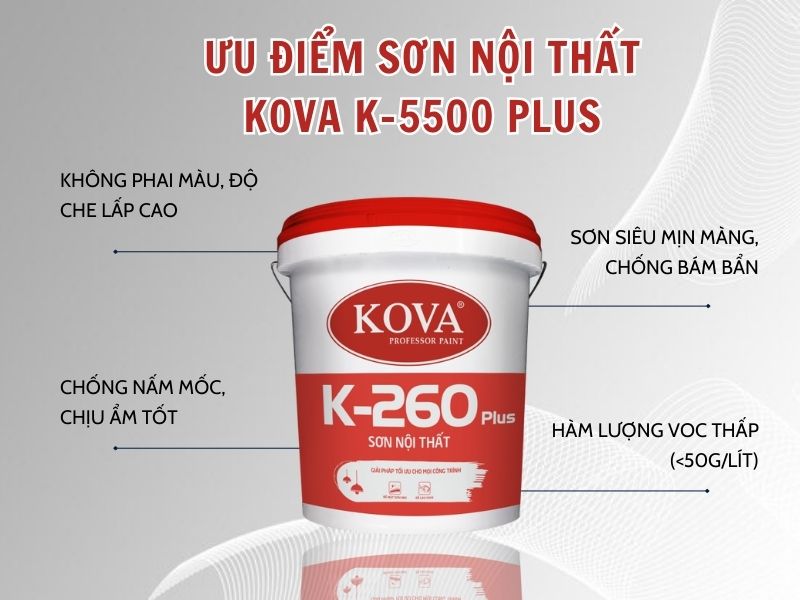 Sơn nội thất cao cấp KOVA K-5500 Plus là sơn nước gốc Acrylic hệ nước với công thức mới kết hợp các hạt phân tử sơn liên kết chặt chẽ với nhau tạo thành lớp bảo vệ chắc chắn trước các tác động của bụi và vết bẩn. Ứng dụng “hiệu ứng cơ chế giọt” giúp bụi và vết bẩn được loại bỏ dễ dàng khi lau chùi. Sản phẩm chứa hàm lượng VOC cực thấp, gần như không mùi, đáp ứng nhu cầu bảo vệ sức khoẻ và môi trường, giúp nâng cao chất lượng cuộc sống, kiến tạo không gian trong lành, phù hợp với những khu vực dành cho trẻ nhỏ và người lớn tuổi. Thông tin liên hệ tư vấn và báo giá chính xác, nhanh nhất Công Ty TNHH Đầu Tư Thương Mại Dịch Vụ Nhất Sơn VP: Thành phố Hồ Chí Minh, Việt Nam Hotline 0917041838 Ms Châu CUNG CẤP SƠN TRÊN TOÀN QUỐC CUNG CẤP ĐẦY ĐỦ CHỨNG TỪ, CHỨNG NHẬN COCQ, HÓA ĐƠN GTGT GIAO HÀNG TẠI TPHCM VÀ LÂN CẬN GỬI HÀNG CHÀNH XE VỀ CÁC TỈNH