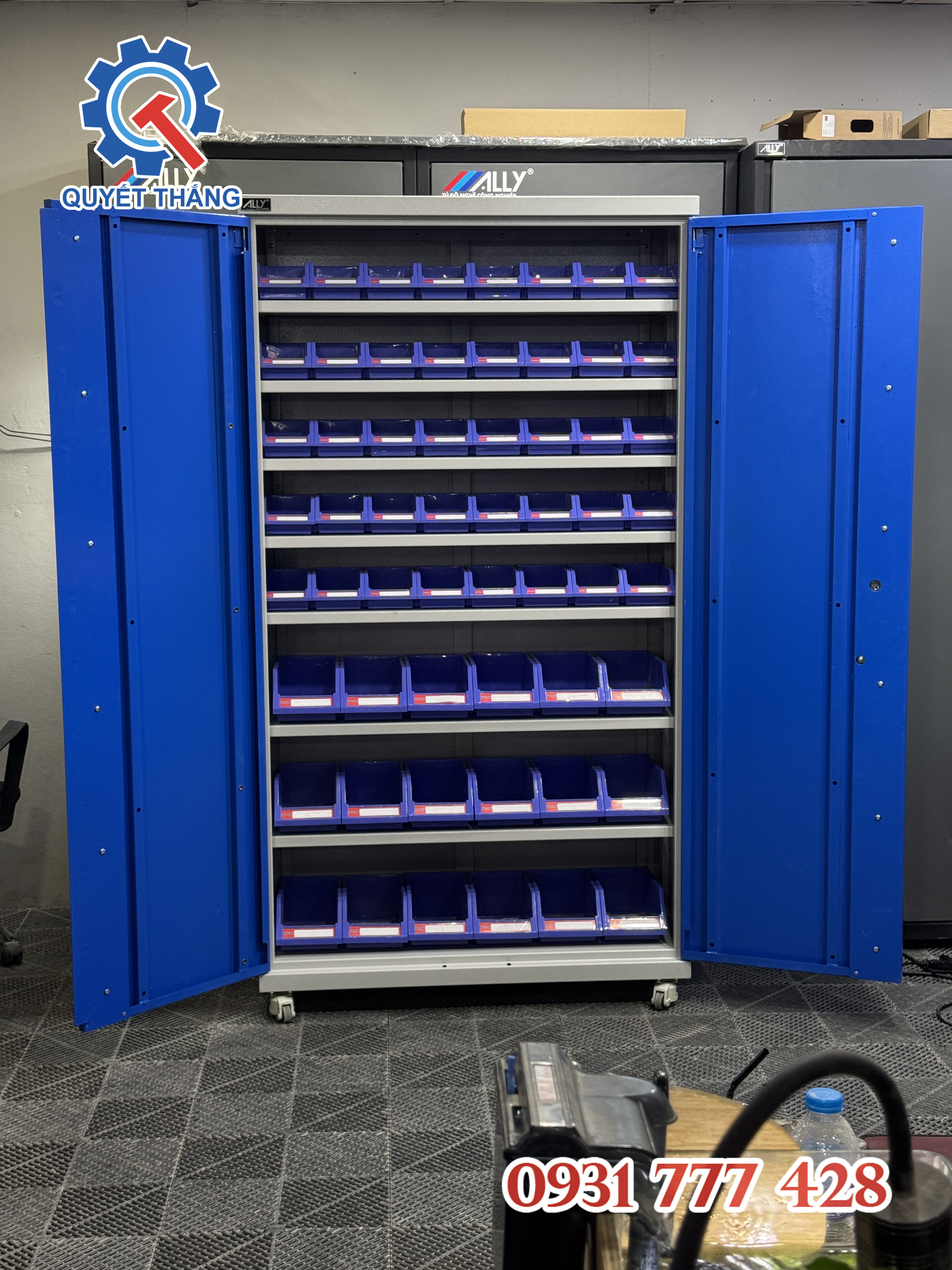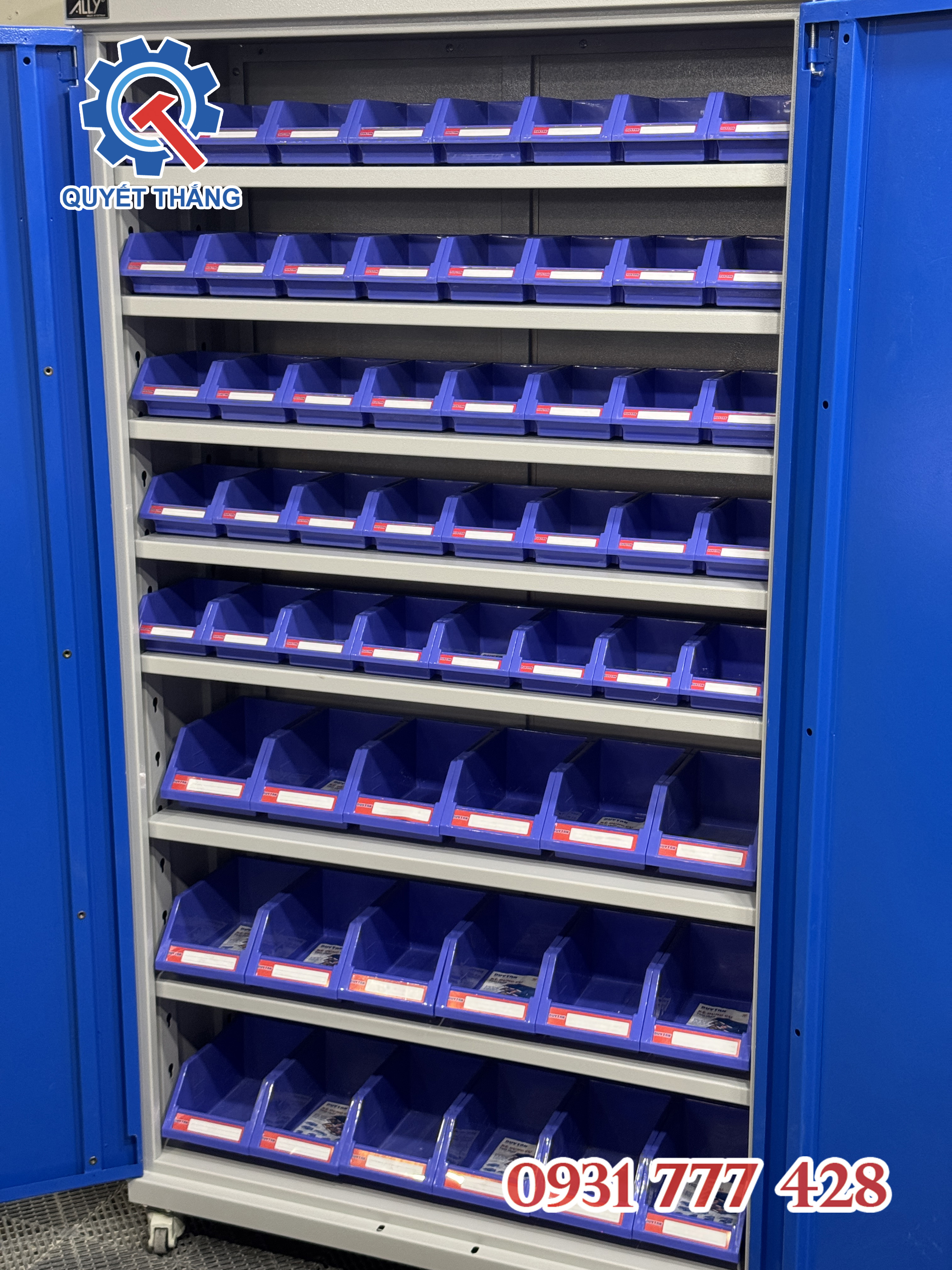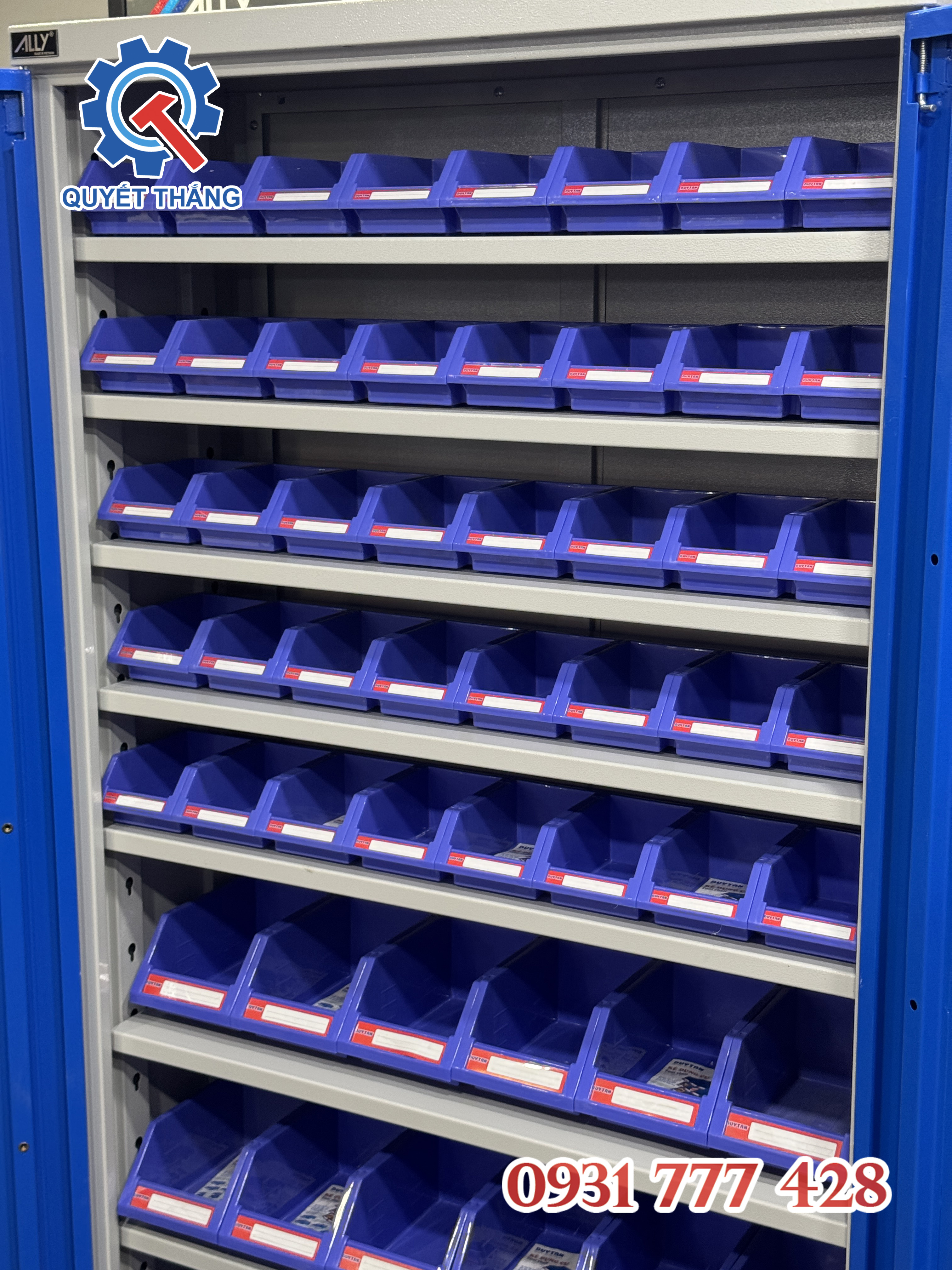 Tủ có kích thước gọn gàng 1000 mm, phù hợp đặt ở nhiều vị trí khác nhau: sát tường, trong kho phụ tùng, hay ngay tại khu thao tác của kỹ thuật viên. Các ngăn nhựa có thể tháo lắp linh hoạt, dễ vệ sinh và thay thế khi cần.