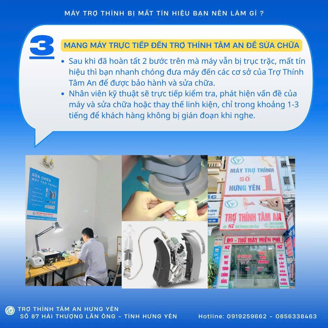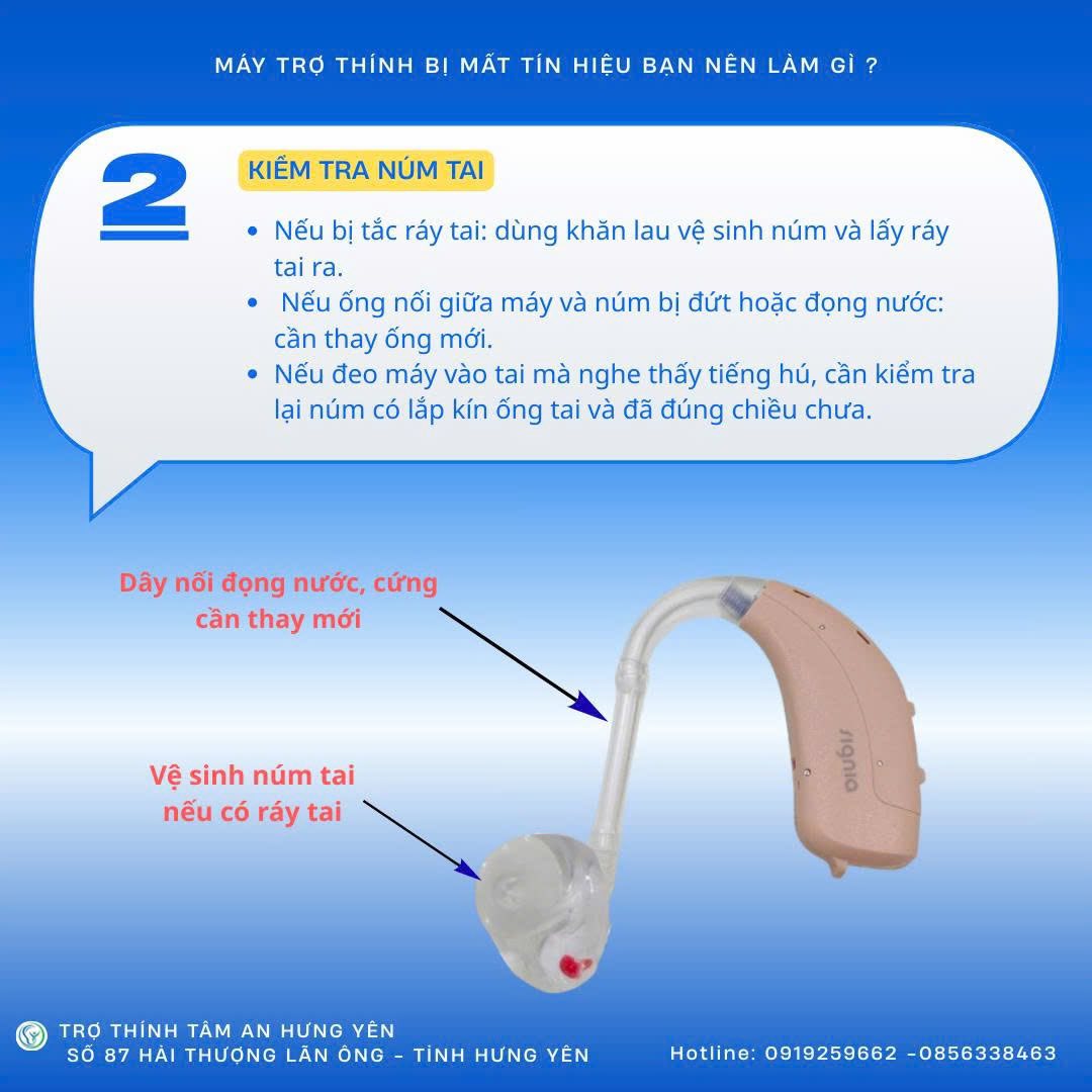 Máy trợ thính bị mất tín hiệu, bạn nên làm gì? Hãy làm theo các bước hướng dẫn sau đây: 𝐁𝐮̛𝐨̛́𝐜 𝟏: Kiểm tra pin, nếu viên pin đã dùng lâu, gần đến thời gian phải thay mới, đừng chờ đợi, hãy thay ngay 1 viên pin mới. Hãy chắc chắn pin mới thay còn nguyên tem, nếu pin mới đã bị tháo tem ra mà không để ý thì dù có sử dụng hay không pin vẫn sẽ bị hao hụt. Trường hợp pin bị hao mòn nhanh, bạn kiểm tra máy có bị ẩm ướt, mồ hôi hay không? Nếu có thì dùng khăn mềm lau khô và để máy trợ thính vào máy sấy chuyên dụng. 𝐁𝐮̛𝐨̛́𝐜 𝟐: Nếu thay pin mới máy vẫn không hoạt động, hãy kiểm tra núm tai. Nếu bị tắc ráy tai: dùng khăn lau vệ sinh núm và lấy ráy tai ra. Nếu ống nối giữa máy và núm bị đứt hoặc đọng nước: cần thay ống mới. Nếu đeo máy vào tai mà nghe thấy tiếng hú, cần kiểm tra lại núm có lắp kín ống tai và đúng chiều. Với trường hợp núm nhỏ so với ống tai gây hú thì nên làm lại núm tai mới. 𝐁𝐮̛𝐨̛́𝐜 𝟑: Sau khi đã hoàn tất 3 bước trên mà máy vẫn bị trục trặc, mất tín hiệu thì bạn nhanh chóng đưa máy đến các cơ sở của Trợ Thính Tâm An để được bảo hành và sửa chữa. Nhân viên kỹ thuật sẽ trực tiếp kiểm tra, phát hiện vấn đề của máy và sửa chữa hoặc thay thế linh kiện, chỉ trong khoảng 1-3 tiếng để khách hàng không bị gián đoạn khi nghe. 𝑯𝒂̃𝒚 đ𝒆̂̉ 𝑻𝒓𝒐̛̣ 𝑻𝒉𝒊́𝒏𝒉 𝑻𝒂̂𝒎 𝑨𝒏 𝒄𝒉𝒂̆𝒎 𝒔𝒐́𝒄 đ𝒐̂𝒊 𝒕𝒂𝒊 𝒗𝒂̀ 𝒔𝒖̛́𝒄 𝒏𝒈𝒉𝒆 𝒄𝒖̉𝒂 𝒃𝒂̣𝒏 𝒕𝒓𝒐̣𝒏 đ𝒐̛̀𝒊. 𝑳𝒊𝒆̂𝒏 𝒉𝒆̣̂ 𝒗𝒐̛́𝒊 𝒄𝒉𝒖́𝒏𝒈 𝒕𝒐̂𝒊 𝒕𝒂̣𝒊: 𝗧𝗥𝗨𝗡𝗚 𝗧𝗔̂𝗠 𝗧𝗥𝗢̛̣ 𝗧𝗛𝗜́𝗡𝗛 𝗧𝗔̂𝗠 𝗔𝗡 𝐇𝐔̛𝐍𝐆 𝐘𝐄̂𝐍 87 Hải Thượng Lãn Ông, P. Phố Hiến, Tỉnh Hưng Yên Hotline: 0919259662 - 0856338463 Zalo: Máy trợ thính Tâm An Hưng Yên (0919259662) Fanpage: Máy trợ thính Tâm An Hưng Yên https://www.facebook.com/maytrothinhchinhhanghungyen Google map chỉ đường: https://maps.app.goo.gl/Ky3Y4ivZqRhFandu7... Tiktok:https://www.tiktok.com/@maytrothinhhungyen Youtube: https://youtube.com/@maytrothinhtamanhungyen Website: https://trothinhtaman.com #maytrothinhhungyen #trothinhtamanhungyen #maytrothinhtrongtaihungyen #maytrothinhchonguoigia #maytrothinhchinhhang #maytrothinhchinhhang #maytrothinhchinhhang #trothinhTamAn #giamaytrothinh #maytrothinhchinhhang