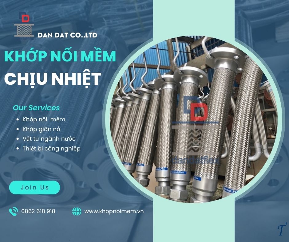 Nhãn hiệu : Dandat.Flex Xuất xứ: Việt Nam Loại khớp nối: bọc lưới, không bọc lưới Đầu nối: nối ren, rắc co, mặt bích, Clamp, đầu chờ,... Tiêu chuẩn đầu nối ren: NPT, PT, BSPP Tiêu chuẩn mặt bích: JIS, ANSI, DIN, BS Áp lực làm việc: 10bar, 16 bar, 25 bar, 40bar Nhiệt độ làm việc cao: Tùy vào vật liêụ sử dụng Môi trường làm việc: Nước, khí, gas, xăng dầu,... (Chúng tôi nhận sản xuất theo yêu cầu của quý khách)