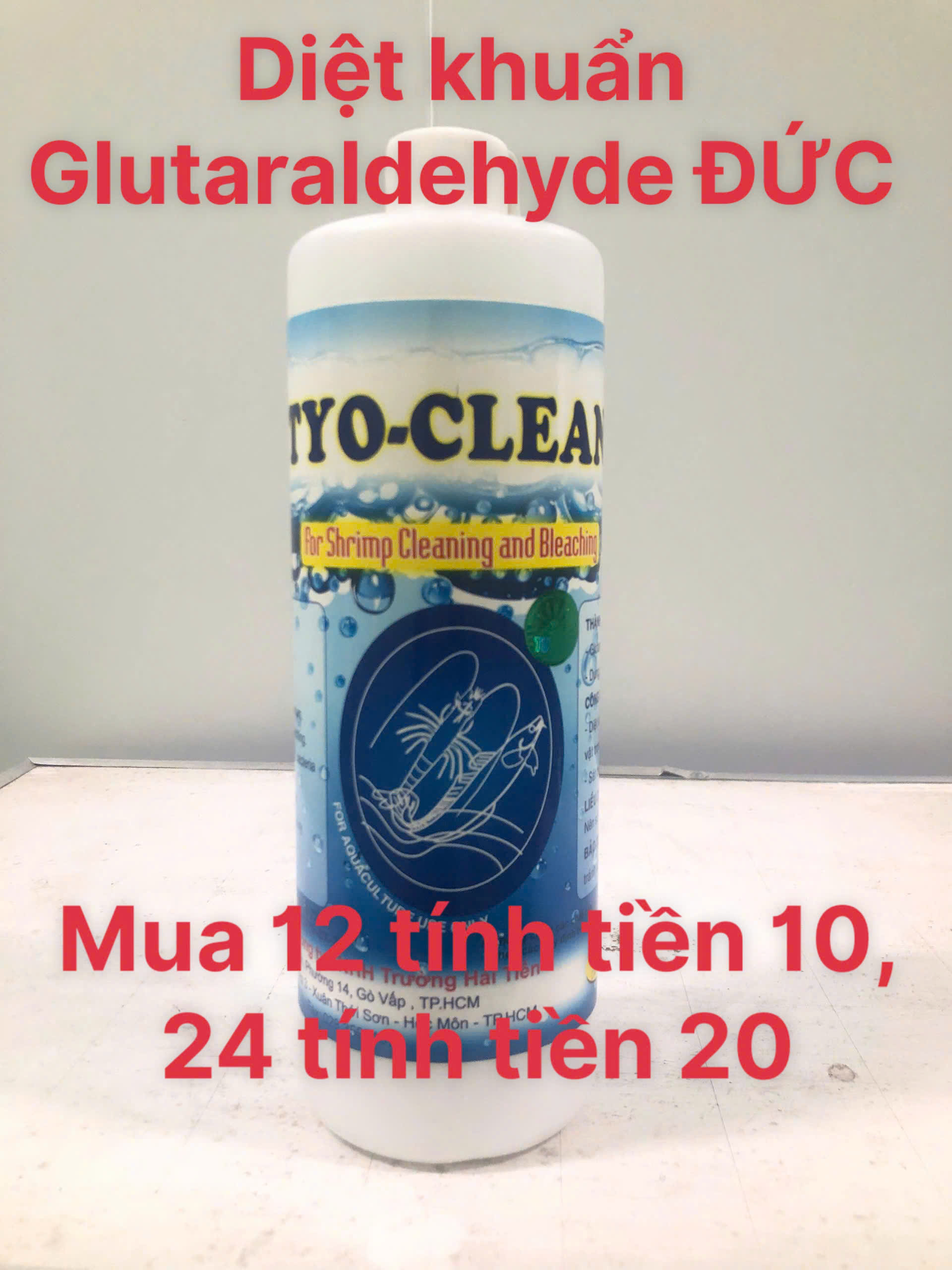 TYO CLEAN – Diệt khuẩn, trị đốm đen Thành phần: Glutaraldehyde Đặc điểm: Dạng nước Công dụng: – Trị đốm đen, đen mang, đóng rong, đóng nhớt – Giảm độ nhờn của nước, làm loãng nước, nâng cao chất lượng nước