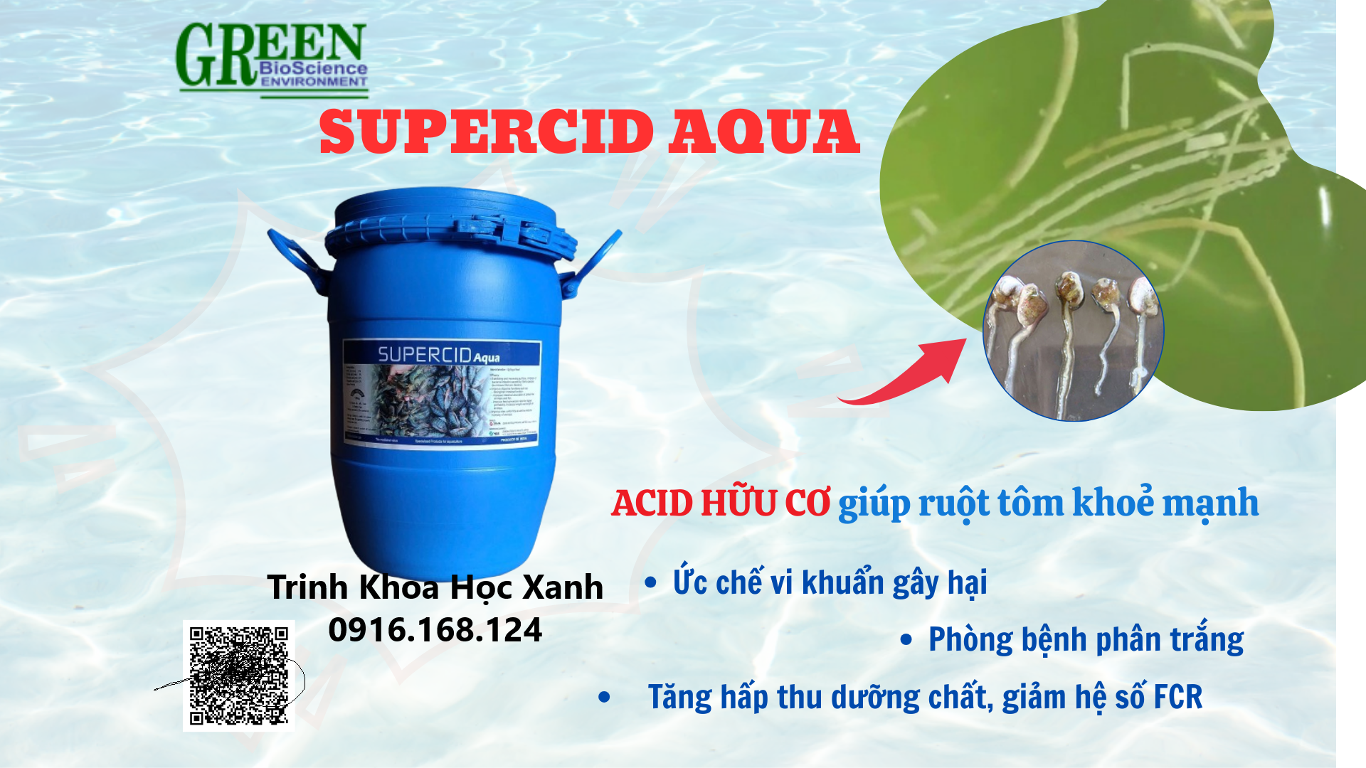 SUPERCID – Acid hữu cơ Thành phần: Acid citric, Acid fumaric, Acid probionic Đặc điểm: Dạng bột Công dụng: – Ổn định pH đường ruột, giúp tôm cá tiêu hóa tốt hơn. – Ức chế vi khuẩn gây hại như Vibrio, Aeromonas. – Tăng khả năng hấp thu dinh dưỡng, hỗ trợ tăng trưởng. – Tăng sức đề kháng, giúp tôm cá khỏe mạnh.