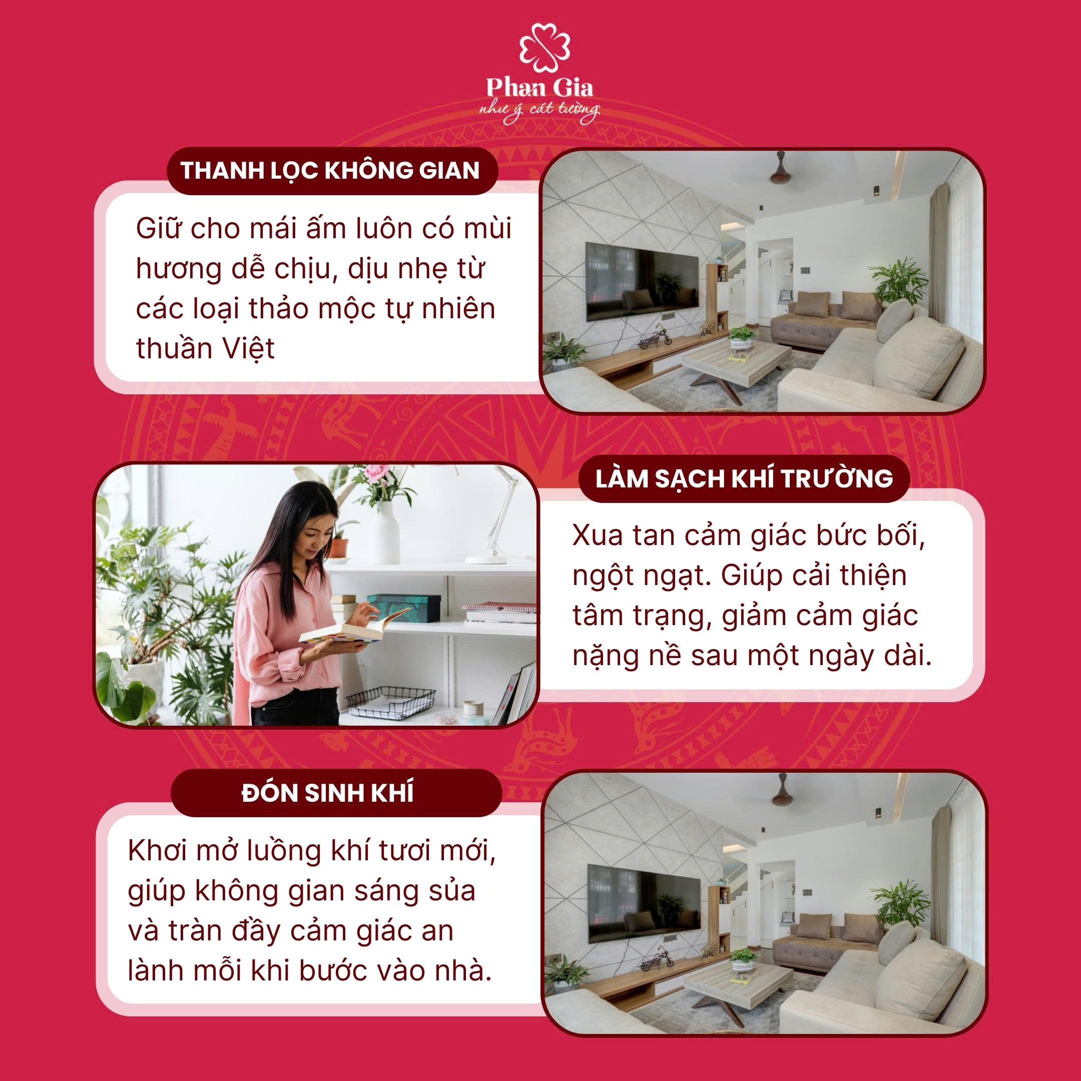 ✨Lợi ích nổi bật: - Làm sạch khí cũ, khí nặng trong nhà sau một thời gian tích tụ. - Giảm cảm giác mệt mỏi, nặng đầu, giúp tinh thần nhẹ nhàng hơn. - Tạo sinh khí mới, giúp công việc – gia đạo thuận lợi hơn. - Khử mùi, làm thơm không gian bằng các loại thảo mộc tự nhiên. - Tăng năng lượng tích cực, giúp giấc ngủ ngon và không gian sống hài hòa.