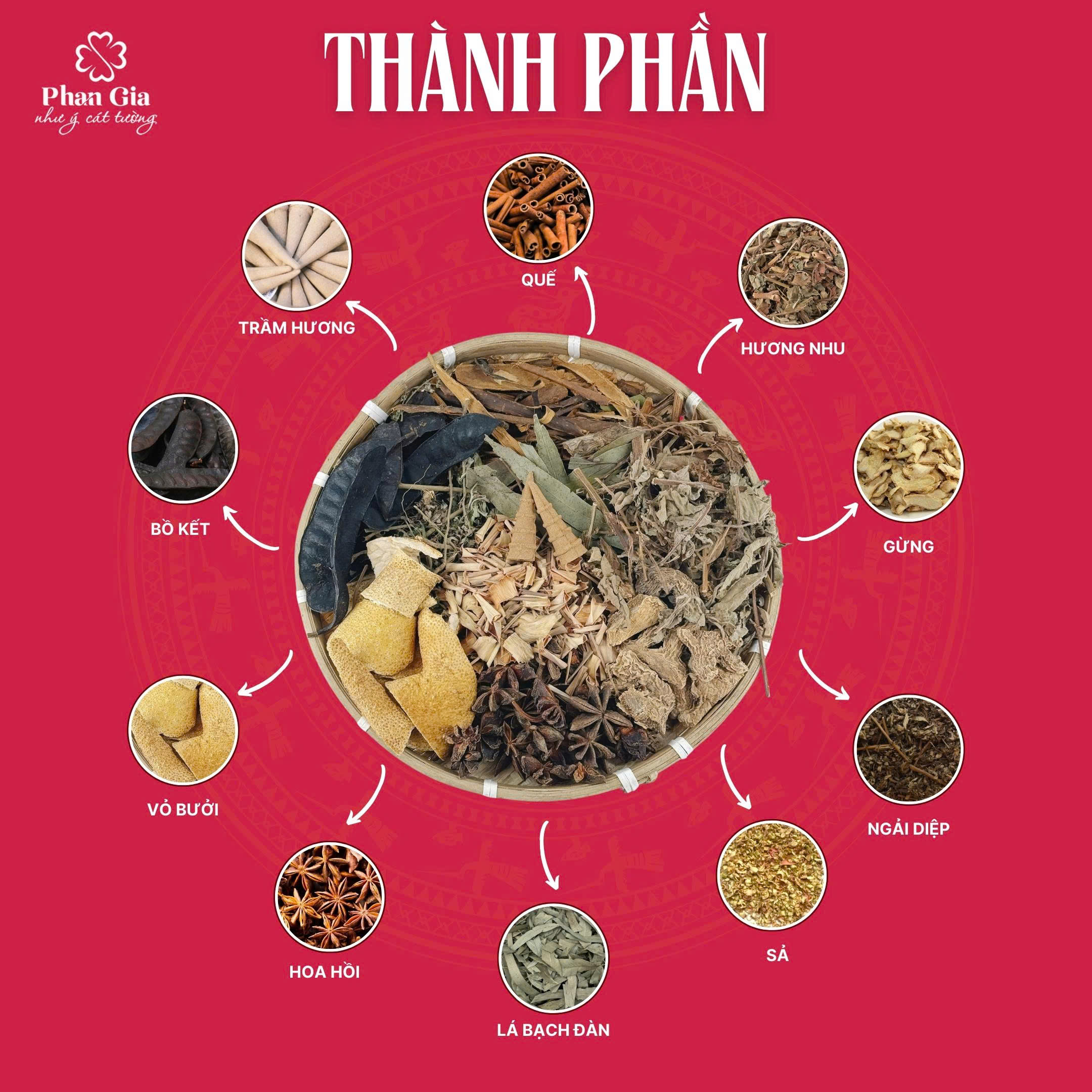 - Gồm 10 loại thảo mộc thuần Việt: Bồ kết, trầm hương, vỏ bưởi, quế, sả, hương nhu, hoa hồi, ngải diệp, gừng, lá bạch đàn (kèm 1 viên than hoạt tính)