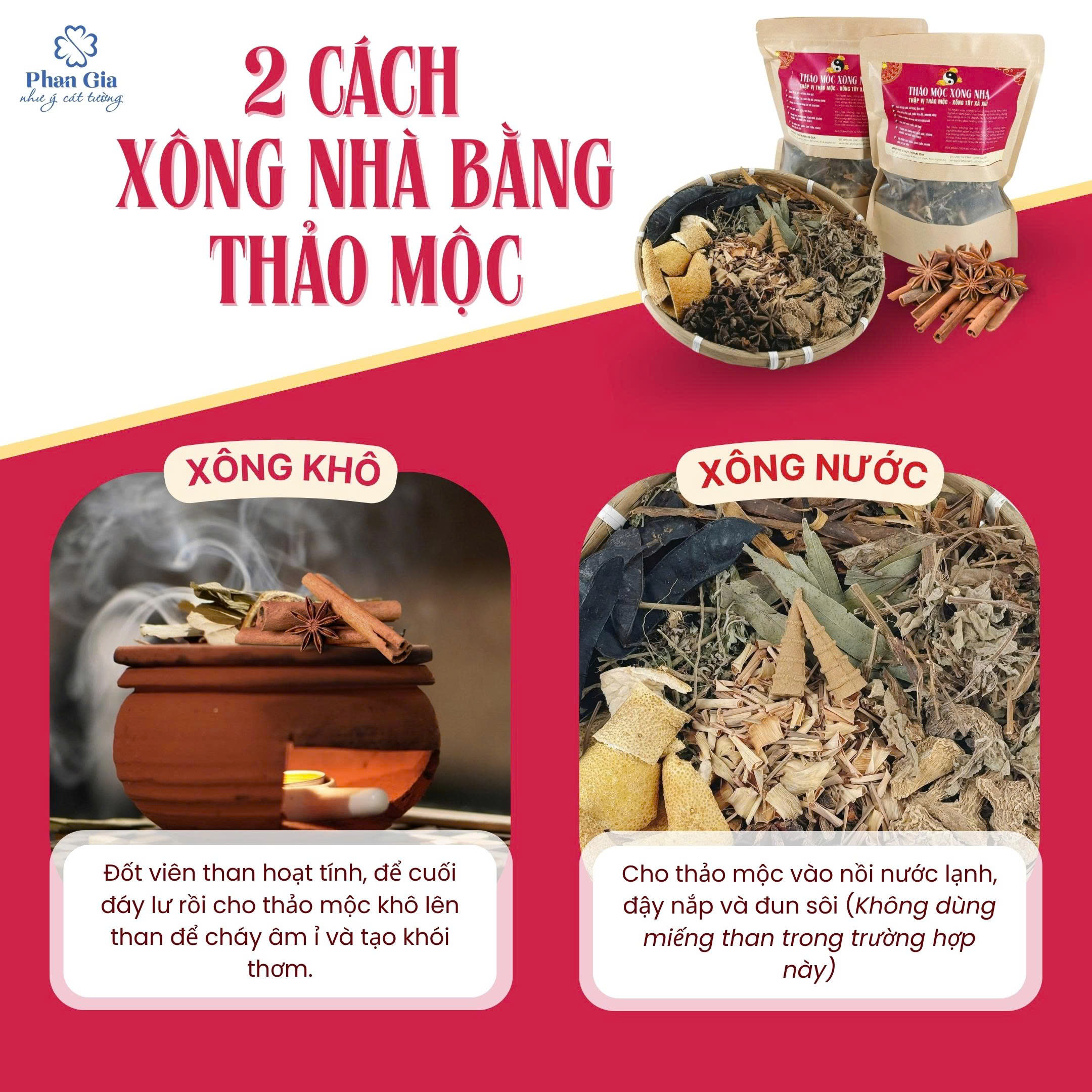- Xông Ướt (Nấu nước): Cho thảo mộc vào nồi nước lạnh, đậy nắp và đun sôi (Không dùng miếng than trong trường hợp này). Khi nước sôi, hé vung và giảm lửa nhỏ để hơi nước mang theo tinh dầu từ từ bay lên. Sau khi xông, có thể dùng nước này để lau nhà hoặc tắm.