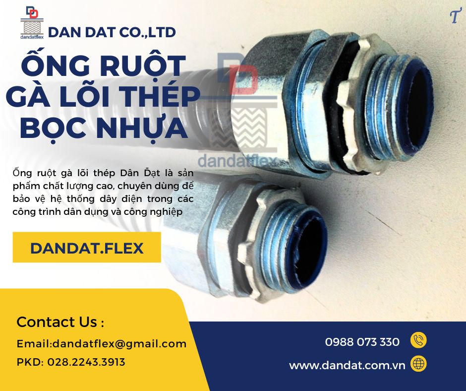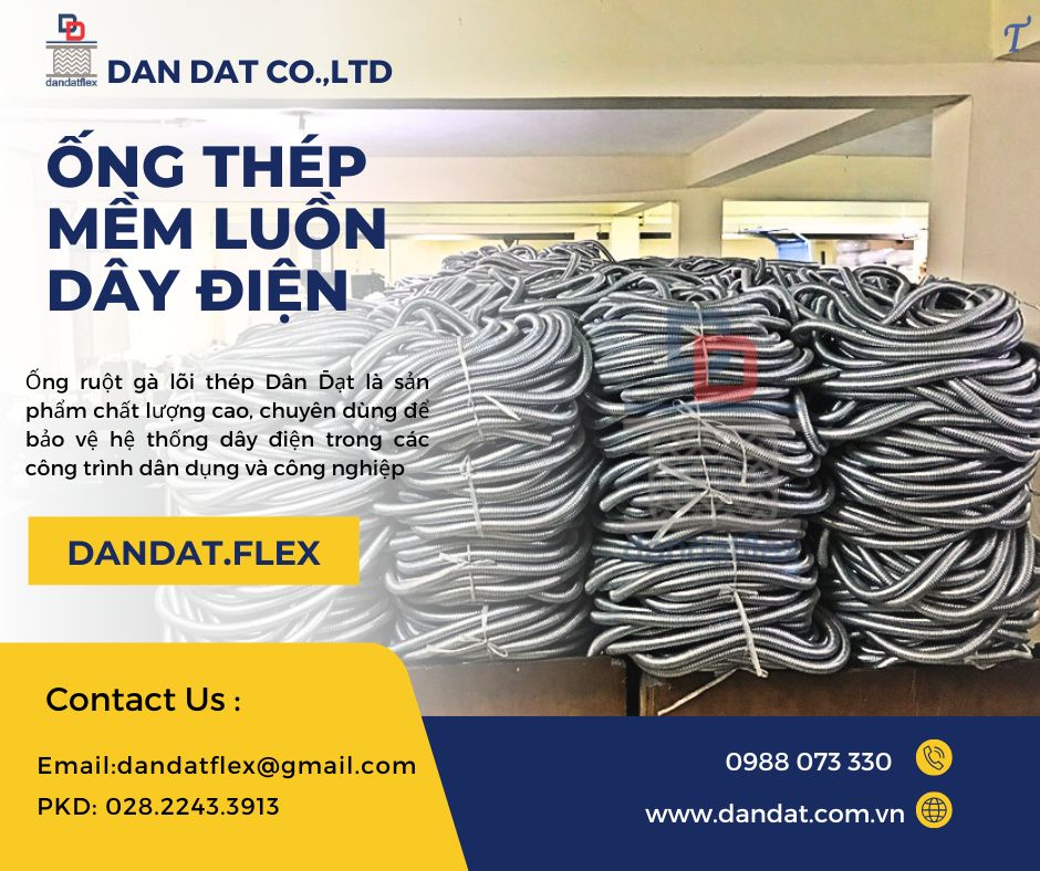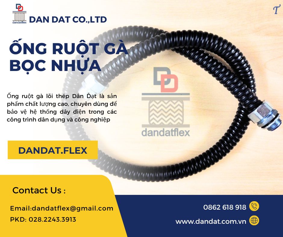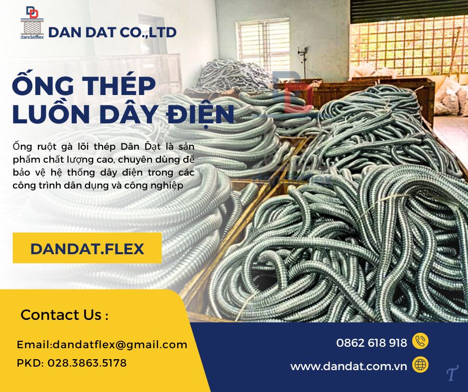 Dan Dat Co.,LTD - Chuyên sản xuất và phân phối ống ruột gà lõi thép, ống ruột gà lõi thép bọc nhựa, ống ruột gà lõi thép bọc lưới, ống ruột gà lõi thép bọc nhựa bọc lưới, ống ruột gà lõi thép bọc nhựa mềm PVC, ống luồn dây điện, ống ruột lõi thép bọc nhựa chống cháy nổ, ống ruột gà lõi thép chống thấm nước và dầu,..Thường được dùng để luồn dây điện trong các công trình thi công điện, tự động hóa, tủ điều khiển, dây chuyền tự động,...Dùng được cả trong nhà và ngoài trời.