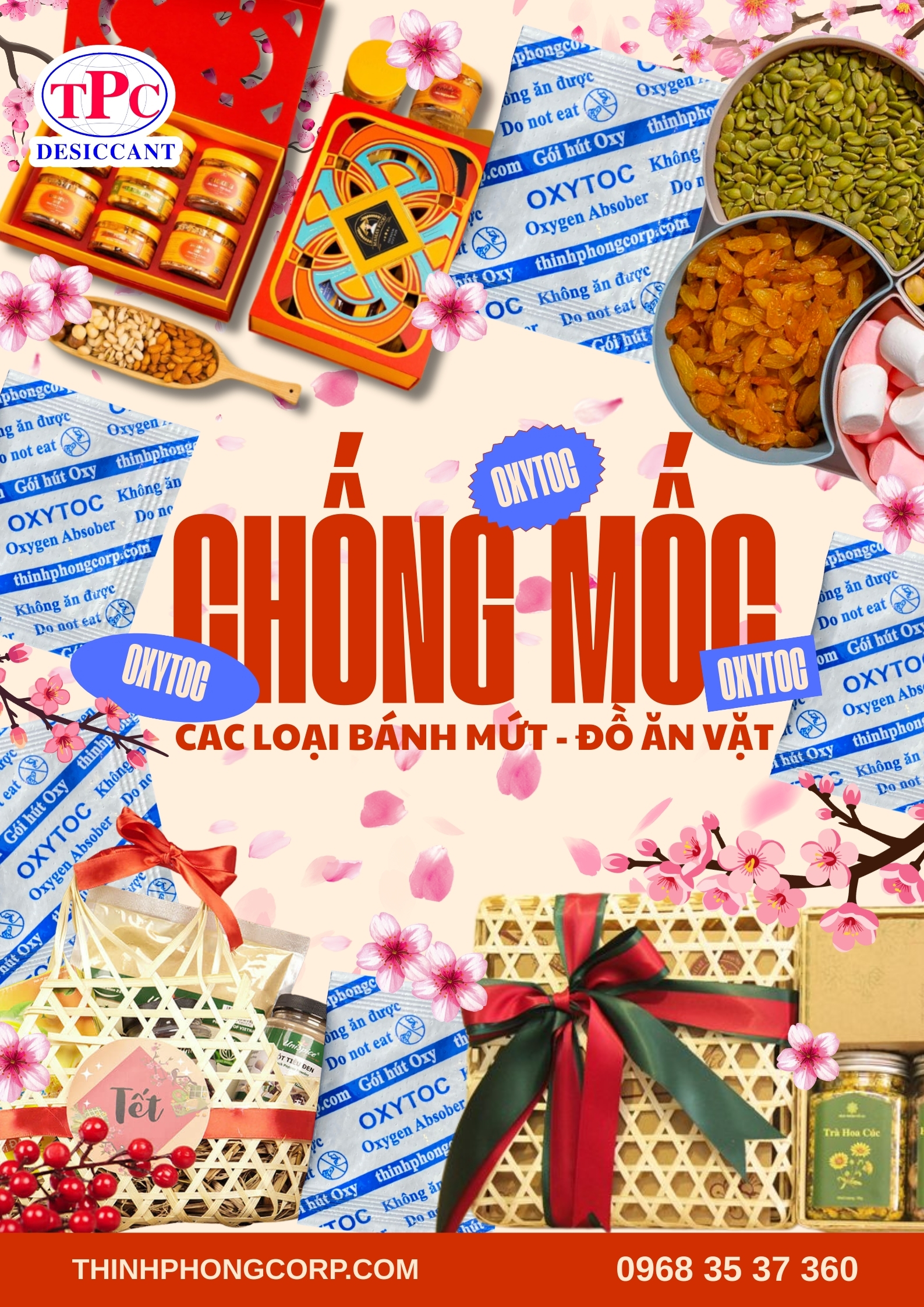 Ứng dụng gói hút oxy OXYTOC chống mốc mứt dừa, bánh kẹo set quà Tết là giải pháp bảo quản an toàn, không dùng hóa chất, giúp sản phẩm giữ trọn hương vị và chất lượng trong suốt mùa Tết.