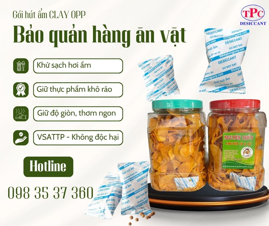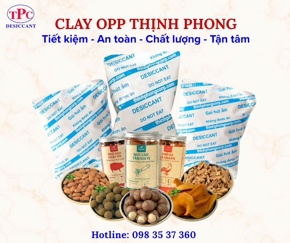 Gói hút ẩm Clay OPP Thịnh Phong được sản xuất từ đất sét tự nhiên, có khả năng hấp thụ độ ẩm hiệu quả trong môi trường kín. Lớp bao OPP giúp tăng độ bền, hạn chế rách vỡ và đảm bảo an toàn khi sử dụng trong thực phẩm. Nhờ đó, sản phẩm vừa đảm bảo hiệu quả hút ẩm, vừa giữ vệ sinh trong quá trình đóng gói.