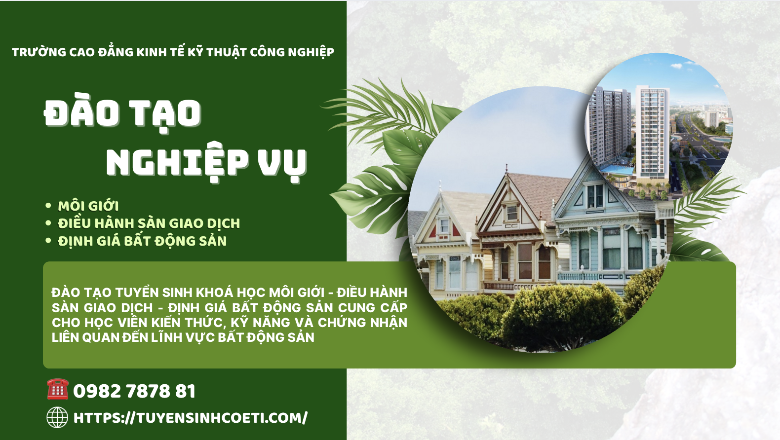 KHAI GIẢNG KHÓA HỌC NGHIỆP VỤ MÔI GIỚI BẤT ĐỘNG SẢN Thời gian học: 19h30 - 21h30 thứ 2, 4, 6 hàng tuần - Hình thức học: Học trực tuyến - Đối tượng tham gia: Các công ty, cá nhân trên toàn quốc có nhu cầu - Học phí 2.500.000/3 khoá: MÔI GIỚI; ĐỊNH GIÁ VÀ ĐIỀU HÀNH SÀN GIAO DỊCH BĐS 💥 Hồ sơ gồm: - Đơn đăng ký (theo mẫu) - 3 ảnh 3x4 - 2 CCCD photo - Sơ yếu lý lịch - Bằng tốt nghiệp cao nhất công chứng (Bằng từ tiểu học trở lên) 💥 Ưu đãi giảm học phí khi đăng ký nhóm 🎓 Cấp chứng nhận Môi giới, định giá và Quản lý sàn giao dịch bđs *** Hỏi - Đáp trực tiếp tất cả những vấn đề liên quan đến BĐS sau mỗi buổi học 📍 Địa điểm: Trường Cao đẳng Kinh tế Kỹ thuật Công nghiệp - Hà Nội, Hải Phòng, Quảng Ninh, Đà Nẵng, Nha Trang, TP. Hồ Chí Minh 📲 Thông tin chi tiết vui lòng liên hệ: 0982 787 881 - cô Linh https://tuyensinhcoeti.com/chung-chi-moi-gioi-bat-dong-san/